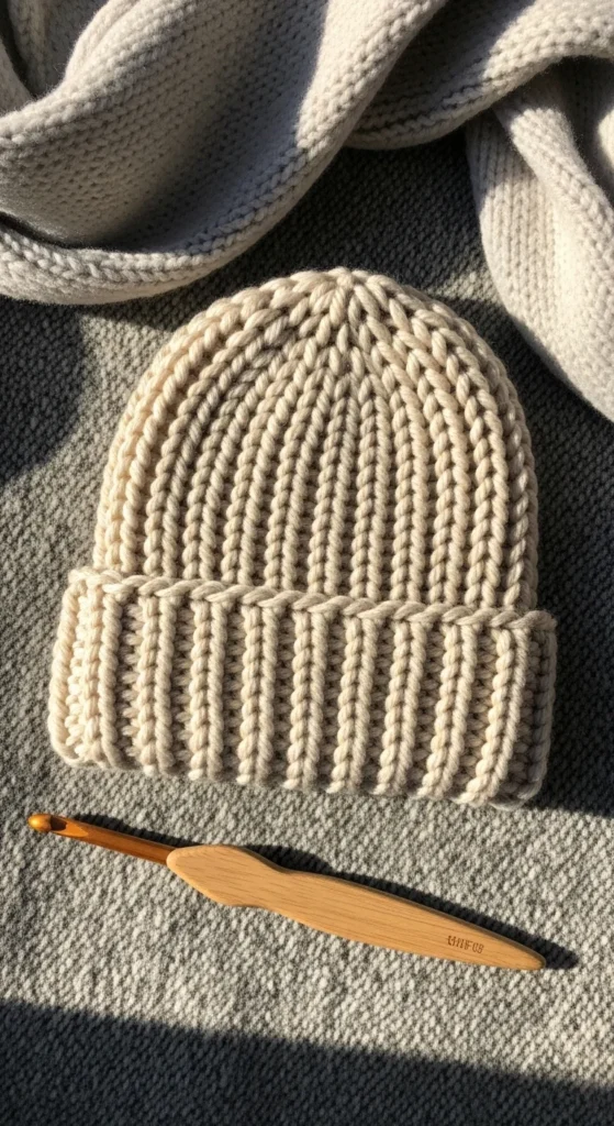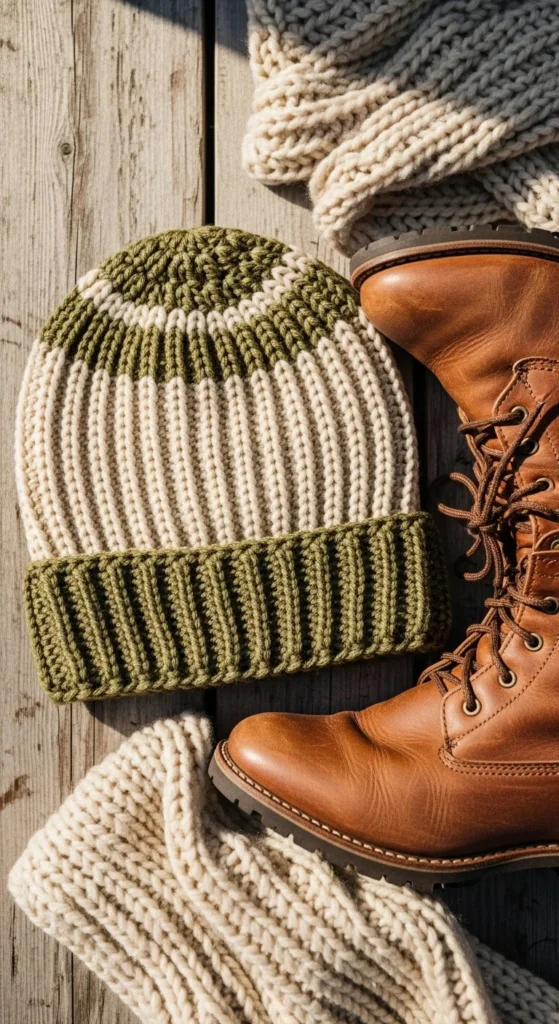 A two-tone ribbed hat gives a little more visual interest than a single-color beanie while still staying easy to wear. The ribbed texture adds stretch and comfort, while the two colors create a subtle contrast that feels thoughtful. You can split the colors by brim and body, alternate wide sections, or use one color as a stripe near the crown. This style works especially well with earthy combinations such as cream and olive, gray and black, rust and beige, or dusty blue and cream. Because the ribbing already gives the hat strong texture, the color contrast does not need to be dramatic to be effective. This is a good choice for gifts and personal wear because it feels a bit more designed than a basic hat without becoming flashy. It is also a practical way to use leftover yarn from other projects. The finished hat feels balanced, warm, and easy to style with everyday winter clothes.