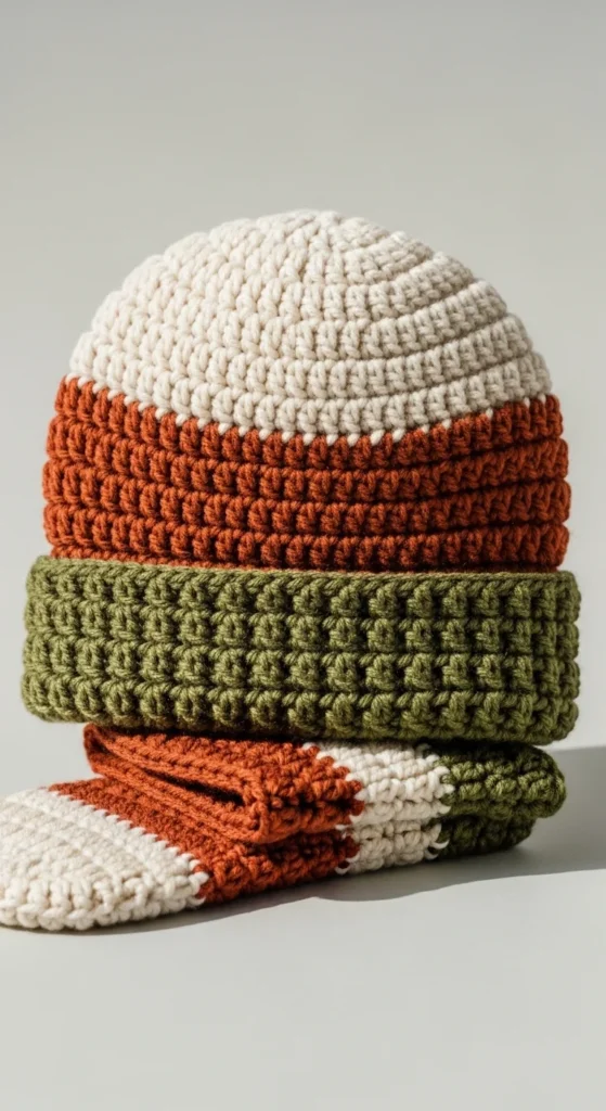 A color-block crochet beanie is a great way to make a simple hat feel more playful without needing a complicated stitch pattern. By using two or three clear color sections, you can create a fresh look even with basic rows and straightforward shaping. This idea works especially well if you have leftover yarn from other projects and want to use it in a stylish way. Choose colors that feel balanced rather than random. Cream with rust, gray with dusty blue, or camel with olive can look especially good. The beauty of a color-block hat is that the colors become the main design feature, so the rest can stay simple. A folded brim, plain body, and neat crown shaping are often enough. This style is ideal for casual winter outfits and handmade gifts because it feels cheerful but still wearable. It is also very customizable. Soft neutrals create a calm look, while brighter pairings give more energy. A color-block beanie is easy to make feel personal without adding much extra cost or difficulty.