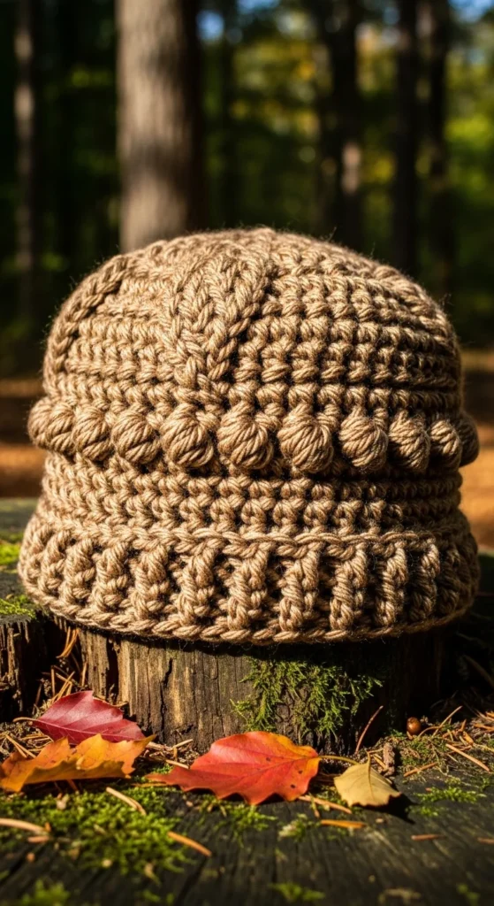 A rustic outdoors hat is a strong choice for people who like earthy colors, textured stitches, and practical winter accessories. This style often uses deeper shades such as brown, forest green, charcoal, or burnt orange, paired with a stitch pattern that feels slightly rugged. Herringbone, woven-looking textures, or simple raised rows all suit this look well. The final hat feels handmade in a very grounded, useful way, which makes it great for hikes, camping trips, countryside outfits, or just people who love cozy natural colors. This idea also works well for men’s gifts or anyone who prefers straightforward accessories without playful extras. Keep the brim snug and the crown shaping neat so the hat stays functional and easy to wear. If you want to save money, use durable acrylic-wool blends rather than high-end natural fibers. The look will still come through if the texture is right. A rustic outdoors hat feels warm, solid, and very dependable, which is part of why it stays such a good crochet idea.