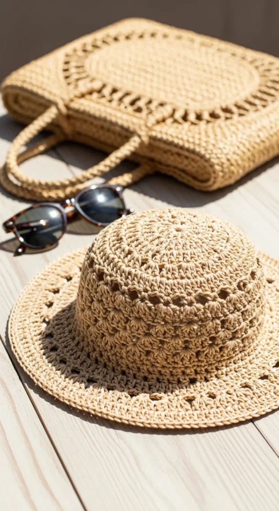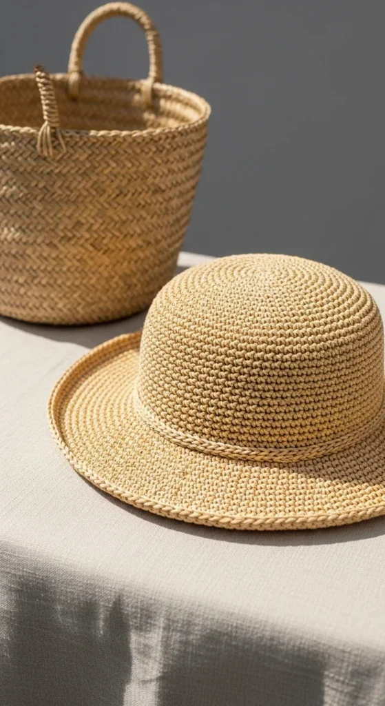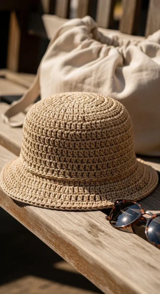 A crochet sunhat with a brim is a lovely option for people who want the handmade feel of crochet with the usefulness of a warmer-weather hat. The wider brim adds shade, while the crochet texture keeps the design interesting and soft. This kind of hat works best in cotton, raffia-style yarn, or something with enough body to hold the brim shape. Beige, honey, cream, and straw-like tones are especially beautiful here because they suit the sunhat style so naturally. This hat looks lovely with simple summer outfits, beach bags, linen dresses, and casual travel looks. It can be kept very plain for an elegant result, or finished with a ribbon band if you want a little extra detail. If budget matters, choose a basic cotton yarn in a natural tone and let the shaping do the work. A crochet sunhat feels relaxed and refined, and it shows that crochet hats can be cozy in a seasonal, handmade way without always relying on winter weight yarn.
