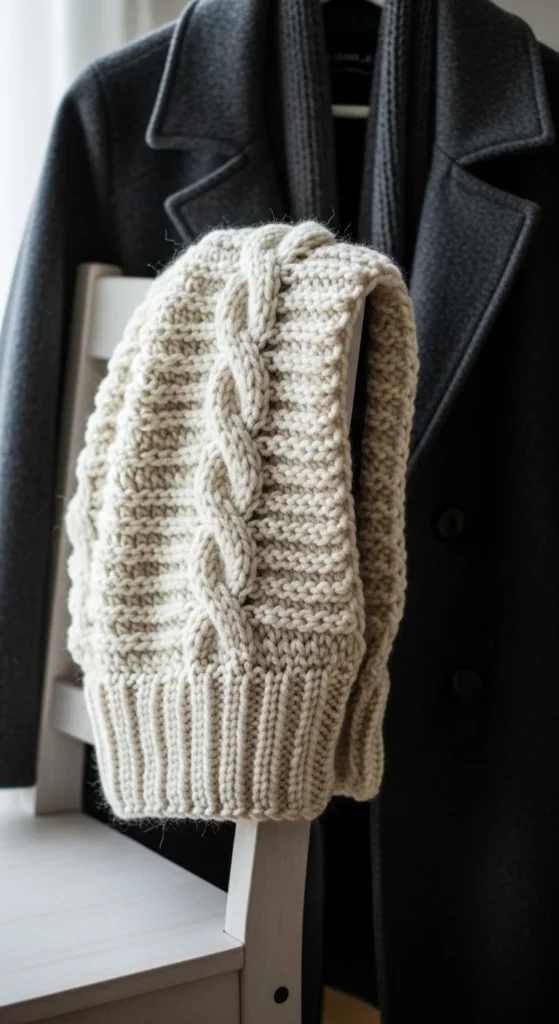 A pom-pom winter hat has a cheerful charm that makes it feel instantly cozy. The main hat can stay quite simple, which is part of why this idea works so well. A plain beanie or textured cap becomes more playful the moment a pom-pom is added on top. Faux fur pom-poms give a slightly dressier look, while yarn pom-poms feel softer and more handmade. This style is especially nice for children, teens, and anyone who enjoys classic winter accessories with a fun detail. It is also a very practical project because the base pattern can be reused again and again in different colors. If you are keeping costs low, make your own pom-pom from leftover yarn rather than buying a ready-made topper. That also helps tie the whole hat together visually. Cream, red, navy, mustard, and soft pink all work beautifully here. A pom-pom hat looks wonderful with scarves, mittens, and winter coats, which makes it a strong gift idea too. It feels playful without losing warmth or everyday usefulness.