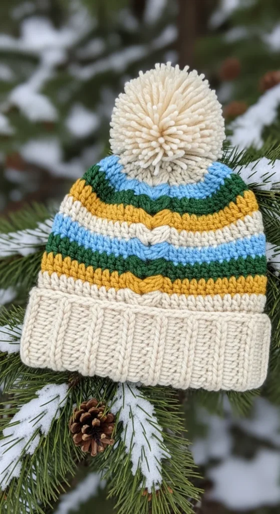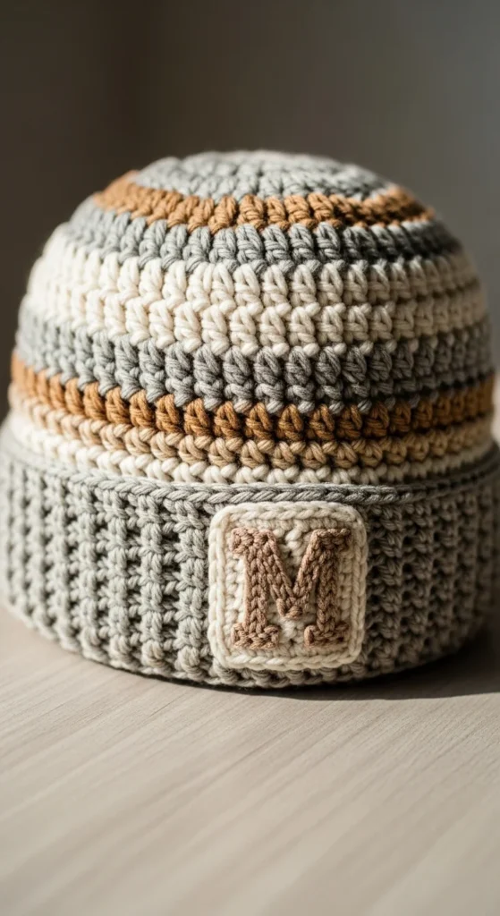 A faux knit herringbone hat is perfect for people who love the look of knitted accessories but prefer to crochet. The herringbone-style texture creates a smooth angled pattern that feels neat and slightly elevated compared with a plain basic hat. It works especially well in earthy or classic shades because the stitch detail becomes easier to see. This style suits men’s hats beautifully, but it also works for anyone who likes a clean, structured look. The texture gives the hat a more tailored feel without requiring extra embellishment. If you want to stay on budget, use one solid yarn color and skip pom-poms or appliqué. The stitch pattern is already interesting enough. A folded brim or a slightly snug fit works well with this hat style because it keeps the shape looking sharp. This is a nice project when you want to grow your crochet skills a little while still making something practical. The finished hat looks rustic, polished, and easy to wear with coats, boots, and simple winter outfits.