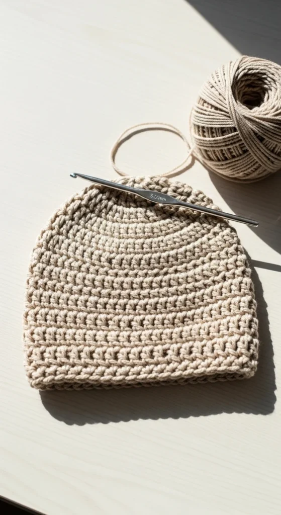 A lightweight summer crochet hat proves that crochet hats are not only for winter. When made in cotton or another breathable yarn, a lighter hat can be worn in warmer weather while still adding style and a bit of sun coverage. This kind of hat usually works best with open stitches, a softer drape, or a casual shape like a bucket hat or easy crusher-style cap. Neutral tones such as sand, white, soft olive, or pale terracotta give the piece a calm warm-weather feel. This is a great project for people who want to wear crochet year-round or make something useful for travel and sunny outings. It is also a good way to use summer-friendly yarn already in your stash. A lightweight hat often looks best with very simple finishing. Let the shape and texture speak for themselves. The result feels relaxed, casual, and easy to pack. It may not have the heavy coziness of a winter beanie, but it still belongs in a list of cozy crochet hats because it keeps that handmade comfort in a lighter form.