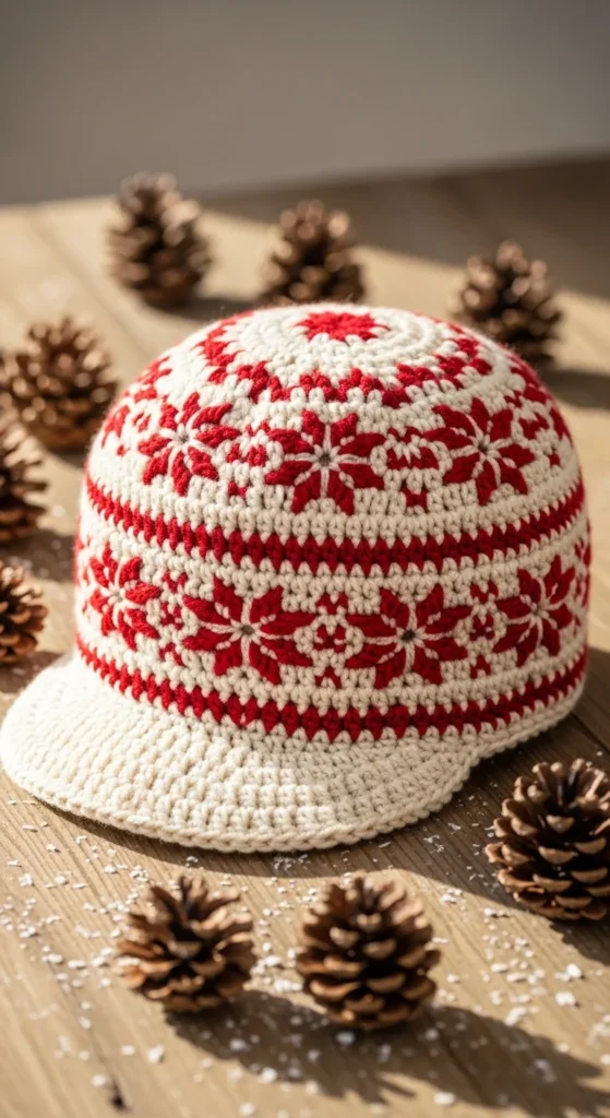 A Fair Isle inspired crochet hat brings color pattern into the mix for a more decorative winter look. While true colorwork can be more advanced, a crochet version can still create a similar festive feel with repeating motifs, bands, or simple overlays. This kind of hat is especially lovely for colder months, holiday gifts, and anyone who enjoys Nordic-style winter accessories. Cream with red, gray with white, or navy with pale blue all make beautiful combinations. If you want to keep things budget friendly, use just two colors rather than a very complex palette. That still gives the hat charm without requiring lots of extra yarn. A simple folded brim and one patterned section near the middle or crown often work best. This style feels cozy, seasonal, and a little more decorative than an everyday beanie, which is exactly why many people enjoy it so much.