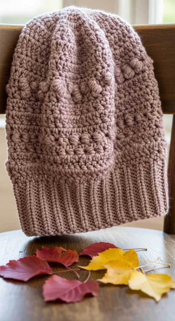 A slouchy textured hat is a lovely choice for anyone who likes crochet pieces that feel a little more relaxed and soft. Instead of hugging the head tightly, the extra length lets the hat fall back with a gentle drape. That makes it feel casual and stylish at the same time. Textured stitches such as V-stitches, puff details, or raised rows can add depth without making the hat hard to wear. This style suits teens, adults, and anyone who likes a slightly looser look than a standard beanie. It also works beautifully in medium-weight yarn, which helps keep the hat soft rather than stiff. If you want to save money, stick to one yarn color and let the stitch texture do the visual work. A slouchy hat looks especially nice in earthy tones, muted pinks, charcoal, and warm cream shades. You can add a pom-pom if you like a playful finish, but it also looks beautiful plain. This idea is ideal for cozy everyday outfits, chilly walks, and handmade gifts that feel modern without being overly trendy.