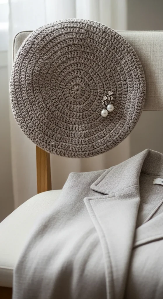 A minimalist neutral beret is a beautiful crochet option for someone who wants something softer and more elegant than a standard beanie. Berets have a slightly dressier feel, and when made in calm neutral tones they can look especially polished. The flat crown and gentle shape give this style a different mood from snug winter hats. It feels more artistic, more city-ready, and very easy to style with coats, sweaters, and scarves. This idea works best in smooth yarn that lets the shape fall nicely without becoming bulky. Taupe, cream, gray, black, and muted blush are especially good color choices for this look. If you want to stay on a budget, skip decorative add-ons and focus on clean shaping instead. The beauty of a beret comes from the silhouette. This is a lovely project for someone who wants a cozy crochet piece that still feels chic and a little refined. It is especially nice for mild cold weather or as part of a handmade outfit with a more dressed-up feel.