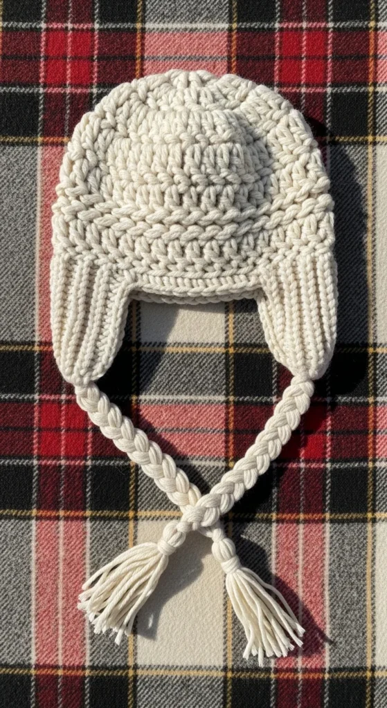 A cozy earflap hat is perfect for the coldest days when warmth matters more than a sleek silhouette. The extra coverage around the ears makes this hat especially useful for children, outdoor walks, snowy weather, and anyone who gets cold easily. This style often looks best in chunky or medium-thick yarn, which helps it feel soft and snug. Braided ties can add a playful finish, but they can also be skipped for a cleaner look. If you want to make the hat feel more stylish, keep the color palette simple and avoid too many decorative extras. Cream, gray, navy, and earthy brown work very well. This is also a practical gift idea because earflap hats feel thoughtful and functional in winter. If you have limited yarn, make the hat in one color and save texture for the body with rows or ribbing. The result is warm, protective, and very cozy in a true winter way. It may not be the most minimal option, but it is one of the most comforting to wear.