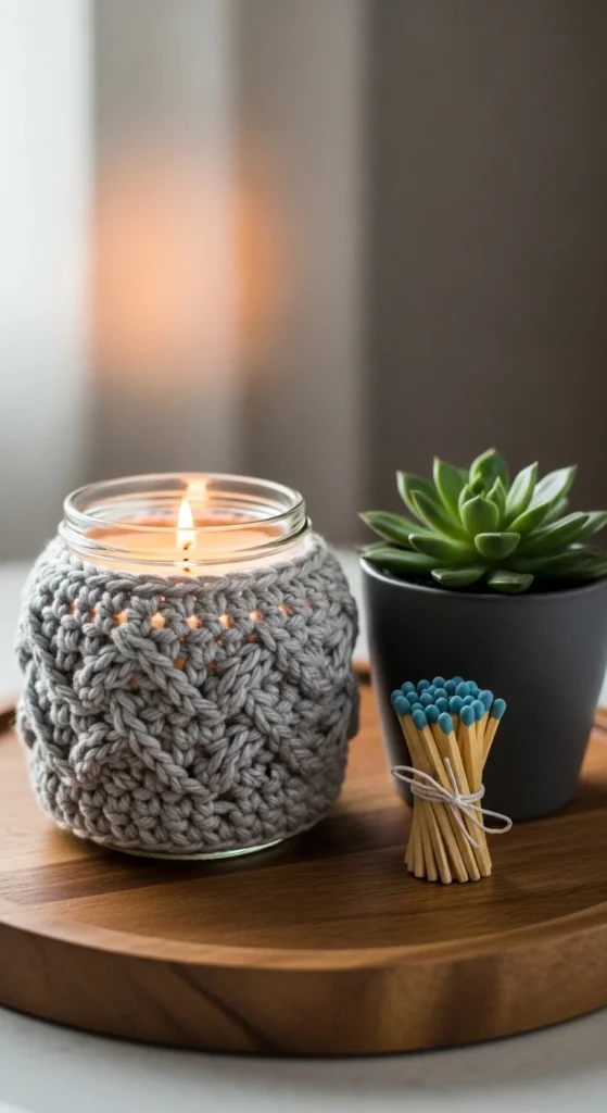 A crochet candle sleeve turns a plain jar candle into a decor piece that looks intentional on a shelf or tray. Crochet a snug wrap that sits below the rim and keep the stitches even so it looks clean from every angle. Neutral colors work in any room, but a muted seasonal shade like rust or deep green can look great for fall and winter. Budget tip: buy budget candles or reuse empty jars and add the crochet sleeve as the “new” part. Place the candle on a small tray with one other item, like a tiny vase or coaster, so it looks like a styled set. This is also a great gift idea because you can finish it quickly and it looks special without being expensive. Small wraps make everyday items look designed.