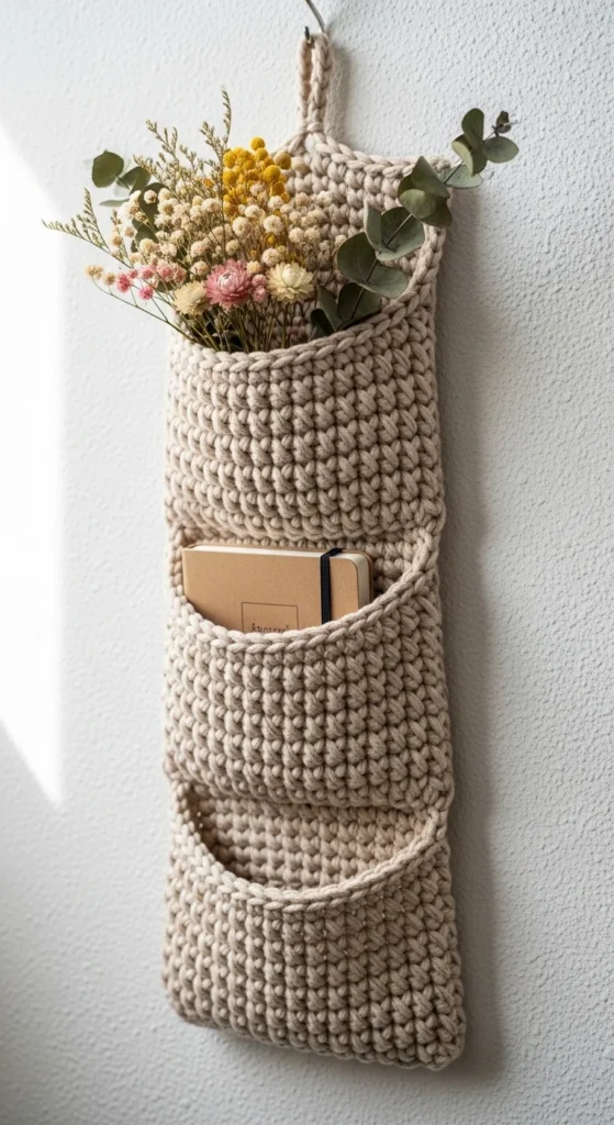 Wall pockets are perfect when you want storage without using floor space. Crochet a flat panel with two or three pockets and hang it from a dowel or a simple hook. Use a tight stitch so the pockets don’t stretch out, and keep the pockets shallow so they hold small items neatly. It works well near an entryway for mail, in a craft room for tools, or beside a desk for pens and notes. Budget tip: make one large pocket instead of multiple small ones if you want to save time and yarn, then add a simple border so it looks finished. Styling tip: keep the items inside minimal so it still looks like decor, not clutter. Wall storage can look soft and tidy at the same time.