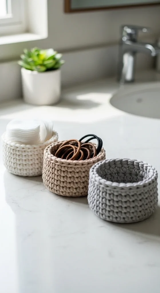Mini crochet baskets are a simple way to make countertops look tidy, especially in bathrooms and bedrooms. Make small containers for hair ties, cotton rounds, clips, or jewelry so everything has a “home.” For a firm shape, use a tight stitch and thicker yarn, and keep the sides straight. Budget tip: make a set of three small baskets instead of one large basket, because small ones use less yarn and look cute grouped together. For styling, stick to one color family so the set looks cohesive, and place them on a small tray to make the area look intentional. These baskets also work on desks for paper clips and chargers, and they make great gifts because they’re useful in any room. Tiny storage makes daily mess disappear fast.