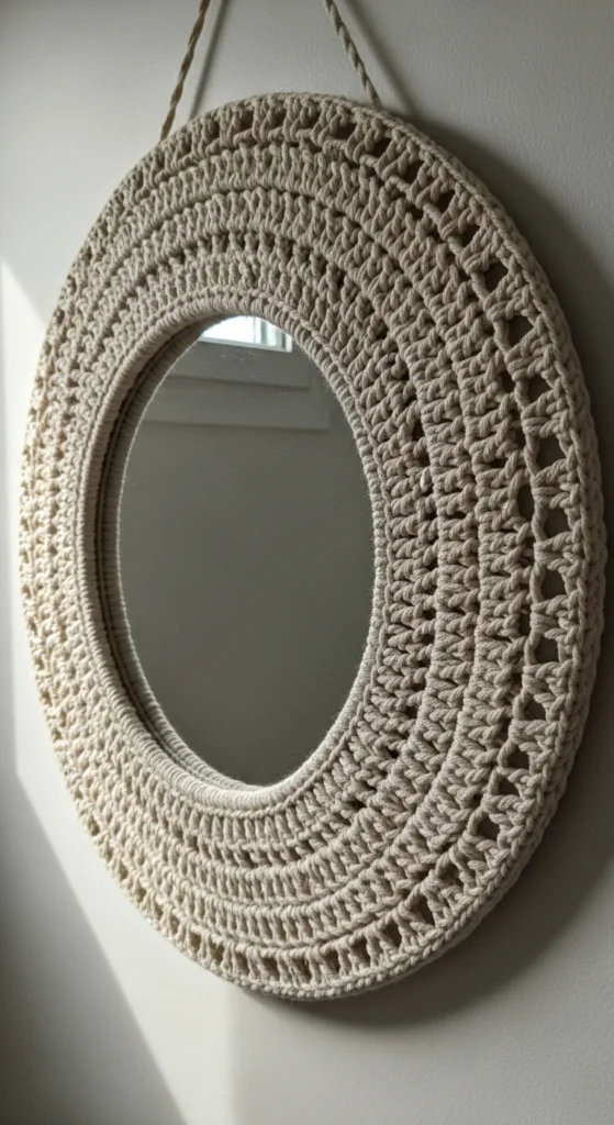 A mirror instantly brightens a room, and a crochet frame wrap adds texture without changing the mirror itself. Use a snug crochet band around the mirror frame, or crochet a full cover that sits over the edge like a sleeve. Keep the stitch pattern simple so it looks clean and doesn’t distract from the mirror. Budget tip: thrift a plain mirror and upgrade it with crochet instead of buying a new framed mirror. Neutral yarn makes it feel modern, while a warm color can add a soft accent to a simple wall. Hang it in an entryway, bedroom, or hallway where you want the wall to feel less empty. A little texture around a mirror makes the wall feel styled.