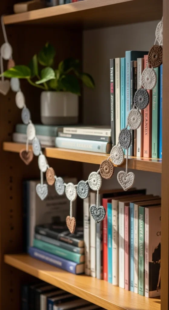A crochet garland is a light, easy decor piece that works in almost any room. Crochet small shapes—circles, leaves, stars, or hearts—and string them evenly on yarn. Keep the colors muted if you want it to blend into the room, or choose one accent color for a subtle pop. Budget tip: garlands are great for scrap yarn, and you can make them while watching a show because the shapes repeat. Drape it across a bookshelf, mirror, mantel, or headboard, and keep the length short so it looks neat instead of messy. If you want a cleaner look, tie small knots between shapes so they stay spaced out. Garlands add charm without taking up space.
