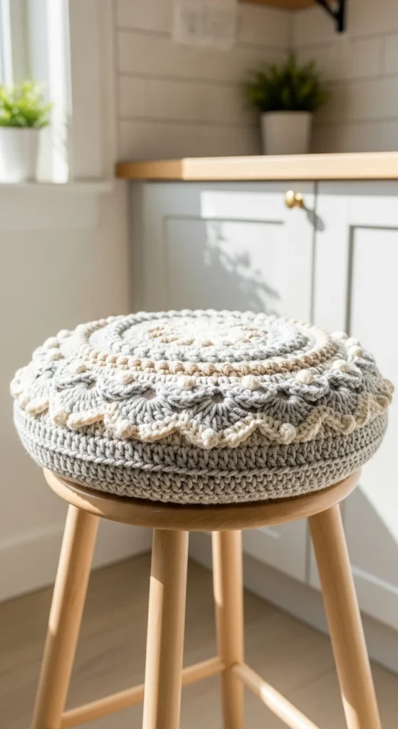 A crochet seat cover makes a basic stool or chair feel softer and more styled. Crochet a round or square cover that ties underneath so it stays in place. Cotton yarn is great here because it’s durable and washable. Budget tip: upgrade a cheap stool with a handmade cover instead of buying a new chair, and keep the design simple so it’s easy to clean and remake later. This works well for kitchen stools, vanity stools, or even a small bench. For a modern look, use one solid color and a textured stitch. Soft seating makes a space feel more inviting.
