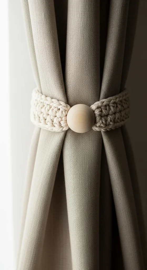 Curtain tiebacks are a small detail that makes windows look styled, especially if your curtains feel plain. Crochet a long band with a loop and add a wooden bead or a simple knot closure. Keep the color close to the curtain color for a calm look, or choose a slightly darker shade for contrast. Budget tip: you only need a small amount of yarn for a pair, and it’s a quick project that feels high effort when it’s done. Tiebacks work in living rooms, bedrooms, and even kitchens, and they make natural light feel more intentional. Little details around windows make rooms feel finished.