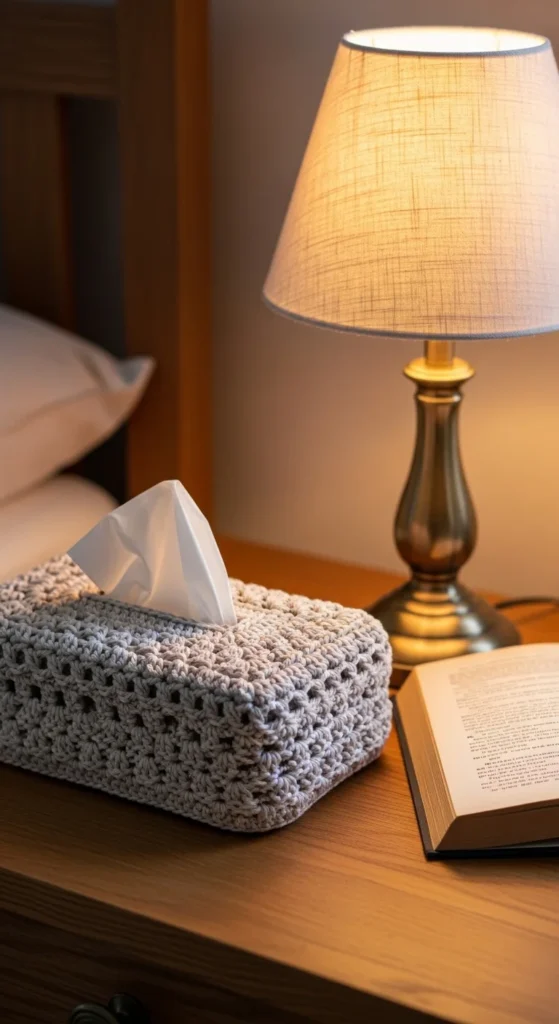 A tissue box cover is one of those “why didn’t I do this sooner” decor upgrades. Crochet a snug sleeve that fits over the box, leaving the opening clear at the top. Choose a neutral yarn so it blends with your decor, and use a simple stitch so it looks clean. Budget tip: this uses a small amount of yarn and instantly hides bright packaging, which makes the room feel calmer. Place it on a nightstand, coffee table, or bathroom counter, and it will look like part of your decor instead of an everyday item. Covering clutter is an easy styling win.