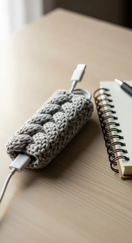 Cables can make a clean space look messy, so crochet cable wraps are both useful and decorative. Crochet a small tube or strap with a button closure that wraps around cords neatly. Make a few in matching colors so your desk setup looks tidy. Budget tip: perfect scrap yarn project, and you can make multiple in one sitting. Use them on phone chargers, laptop cables, and even earbud cords. When cords are organized, the whole desk feels calmer. Small organizers make spaces look cleaner instantly.