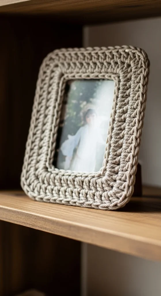 If you have shelves with frames that feel plain, a crochet frame accent can add texture without changing the photo or buying new frames. Crochet a thin border that wraps around the frame edge or glue a crochet strip along the outer frame. Keep it subtle with neutral colors so it looks clean. Budget tip: upgrade thrifted frames with crochet and paint the frame in a simple matte tone if you want an even more cohesive look. Style two frames together with one crochet-accent frame and one plain frame so the texture stands out. Tiny changes on shelves make the whole wall feel styled.