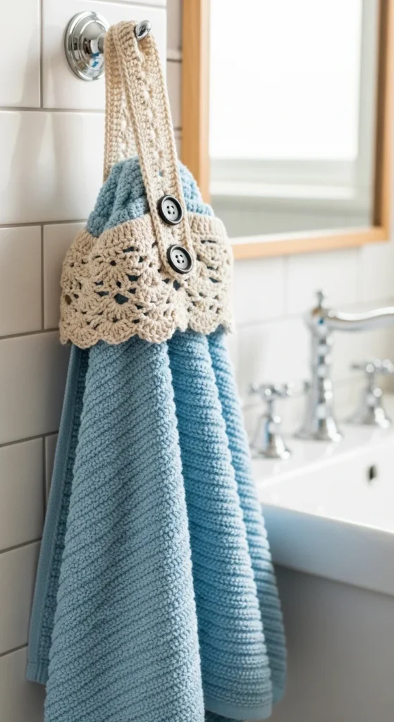 Towel toppers help towels stay in place on hooks, and they make a bathroom or kitchen feel more styled. Crochet a topper that buttons around a towel, then hang it on a hook. Choose cotton yarn so it washes well and stays sturdy. Budget tip: use basic dish towels and upgrade them with crochet toppers instead of buying fancy towels. Make a matching set for a clean look. Practical details make rooms feel more put together.