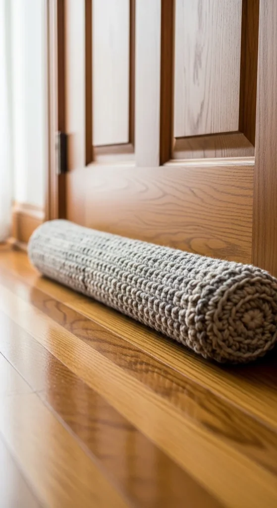 A crochet draft stopper is cozy decor that also helps with drafts and dust. Crochet a long tube, fill it with rice or polyfill, and stitch it closed. Keep it in a neutral color so it blends into the floor and door. Budget tip: use scrap yarn for the outside and fill with inexpensive rice from the grocery store. Place it at the base of bedroom doors, balcony doors, or entry doors. Comfort and decor can be the same thing.