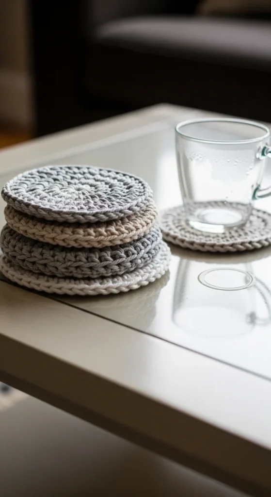 A coaster set is small, useful, and it instantly makes a coffee table look more intentional, especially when the colors match your room. Cotton yarn works best because it handles moisture better and keeps the coasters flatter, and a set of four or six feels like a complete decor piece instead of a random item. Keep the design simple for a modern look, or add a thin stripe in a second color if your space feels plain. Store them in a small dish, tray, or mini basket so they become part of the styling, not something you hide in a drawer. For a budget-friendly approach, use one skein of cotton yarn and stick to a basic pattern you can repeat quickly, and if the coasters curl, flatten them under a heavy book overnight. Practical decor is the kind that stays out because it gets used.