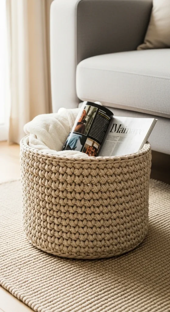 6) Crochet Storage Basket for Throws and Clutter