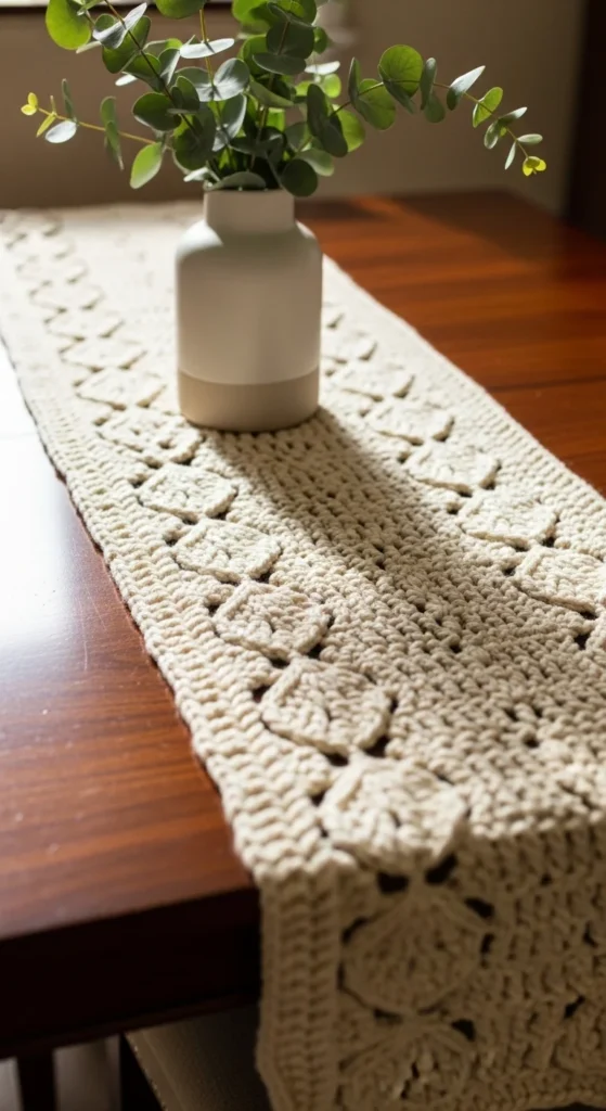 A crochet table runner adds softness to a dining table and instantly makes it feel styled, even if the rest of the room is simple. Keep it long and narrow so it looks clean and doesn’t fight with plates and serving dishes. A repeating stitch pattern works well because it looks detailed without being hard to make. Stick to neutral yarn if you want it to fit every season, or use one muted color that matches your curtains or rug. Budget tip: make a shorter runner for a console table or coffee table first, because it uses less yarn but gives the same “decor upgrade” feeling. If you want a neat finish, block it flat or steam it lightly so the edges sit smooth. This is also a nice gift for someone who loves hosting, because it’s decorative and useful at the same time. A runner makes a table look set even when it’s empty.