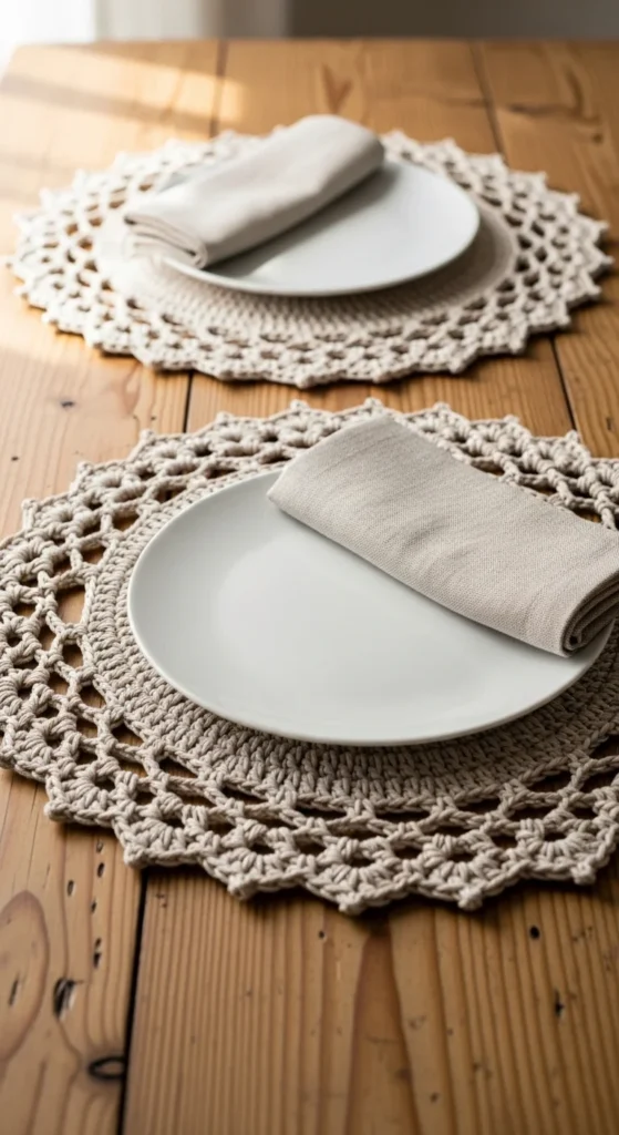 Placemats are a great project because they’re flat, simple, and they add texture to a dining table or breakfast nook. Cotton yarn is a smart choice because it’s washable and handles spills better than fuzzy yarn. Keep the shape classic—round or rectangle—and use a tight stitch so the mat lies flat and looks tidy. Budget tip: make two placemats first and use them daily, then build the set over time instead of buying a big amount of yarn at once. You can also mix two similar neutral shades to stretch what you have while keeping a cohesive look. For styling, pair crochet placemats with plain plates so the texture stands out, and keep napkins simple so the table doesn’t feel busy. Everyday items can still look handmade and clean.