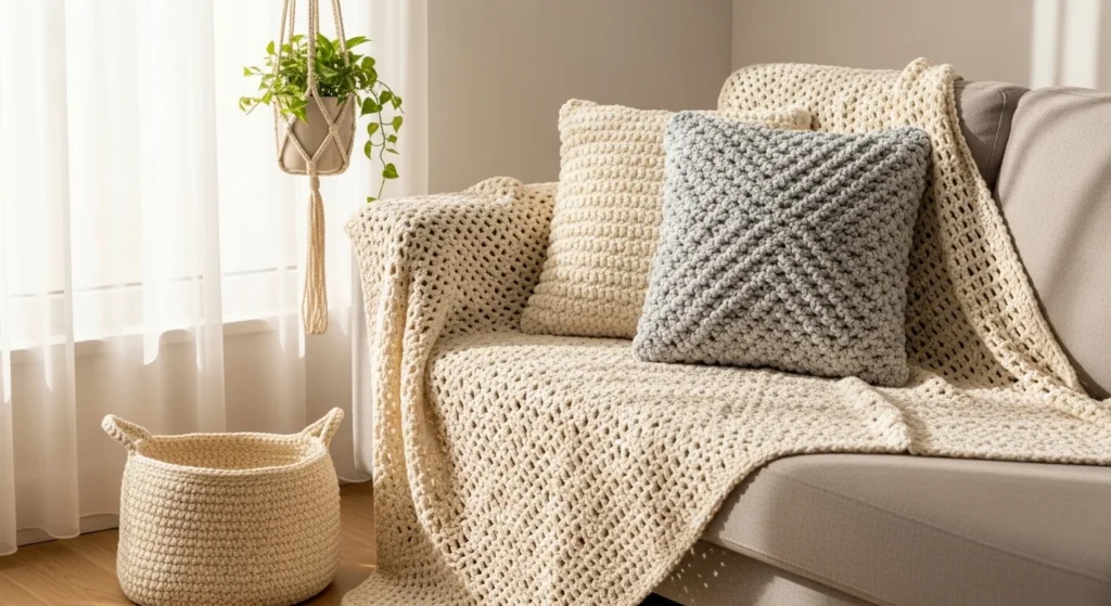 Crochet pillow covers are perfect when you want a new look without buying new pillows, because you can reuse the same insert and swap covers whenever you want. Choose a tight stitch pattern so the cover holds shape and looks tidy, and keep the color neutral—cream, beige, warm gray, or off-white—so it works in any room. If you want a little contrast, make one pillow in a muted accent like sage or dusty blue, then pair it with a neutral crochet pillow so it doesn’t feel loud. To keep it affordable, thrift pillow inserts or reuse the ones you already own, and use an envelope-style back so you don’t have to buy a zipper. Styling tip: place one textured crochet pillow next to one smooth fabric pillow, because the difference in texture makes the crochet stand out without adding clutter. One good cover can change the whole sofa.