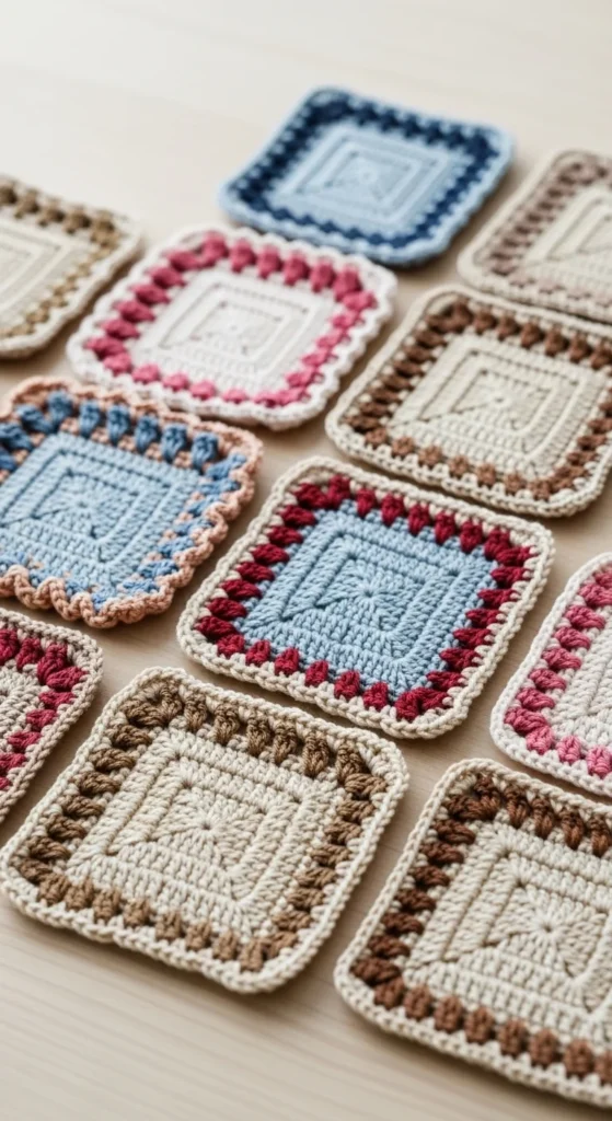 Using squares allows you to practice decorative edges. Try scallops, picots, or simple ridges. These borders add charm to blankets and garments, so practicing them now helps later.