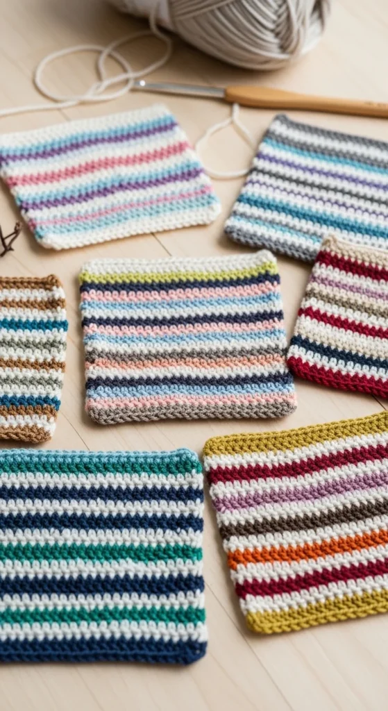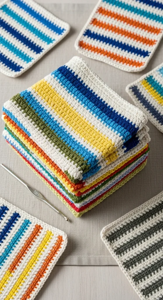 Dishcloths allow you to practice new stitches in a small format. Add simple stripes to make them decorative and useful.
