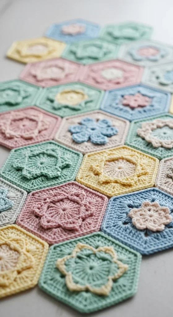 Hexagons are fun alternatives to squares. Try a few to understand shaping. These motifs combine beautifully for blankets or cardigans.