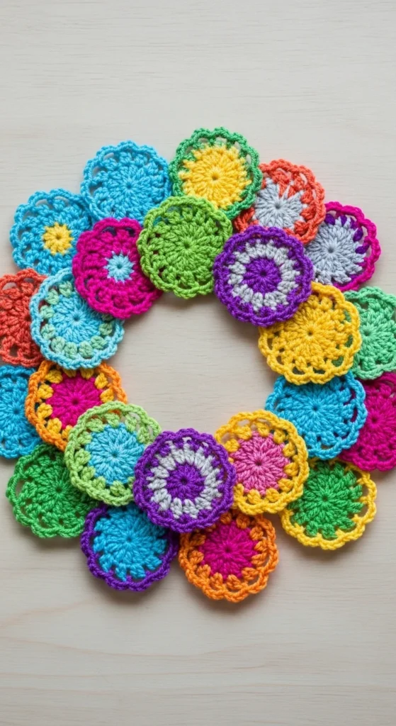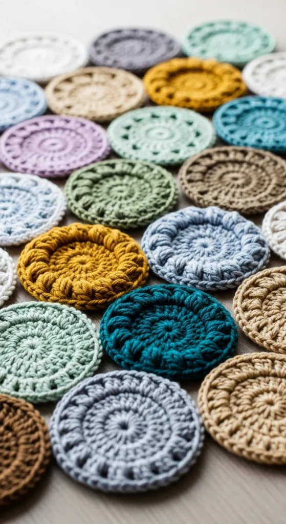 Experiment with circles using various stitches. Try tight ones, loose ones, or layered ones. These can become coasters, appliqués, or motifs for bigger pieces. The shape helps you practice consistent increases.