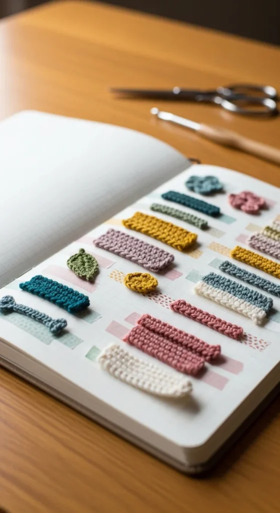 Create a journal page with yarn snippets, doodles, and color swatches. This page becomes a visual reference for future projects. It’s also a fun way to stay inspired when you’re between larger items.