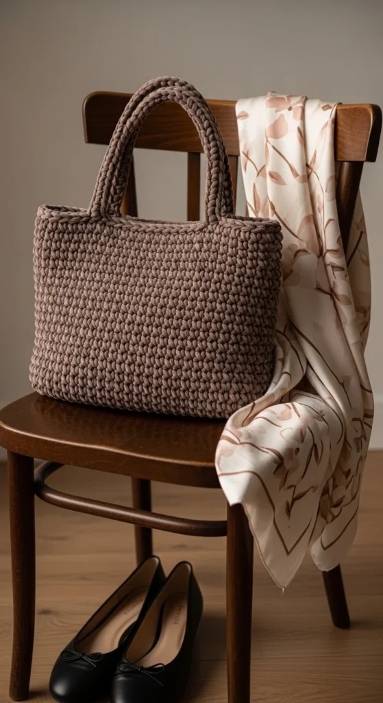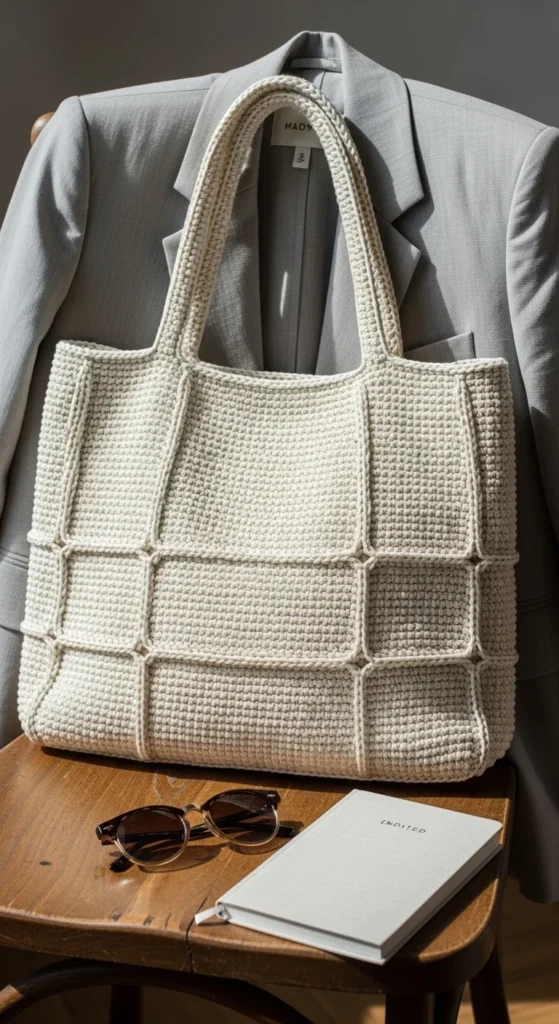 A chunky multi-strand professional tote is a smart idea when you want a crochet bag with thicker fabric and stronger shape. Holding several strands together creates a dense body that feels closer to a ready-to-wear knit bag than a typical airy crochet tote. That thickness helps the bag stand better and gives it a more expensive look. Oatmeal, cream, grey, taupe, and black all work beautifully because the extra texture becomes the focus. Keep the tote shape simple and square or slightly rectangular so the heavy fabric does not get lost in fancy shaping. Strong handles matter here since the bag itself will have more weight. A lining can make it even sturdier, but the multi-strand body already does a lot of the structural work. This tote is ideal for anyone who wants a professional-looking crochet bag without relying on complicated stitch patterns. The polish comes from the dense fabric, clean lines, and solid everyday palette.