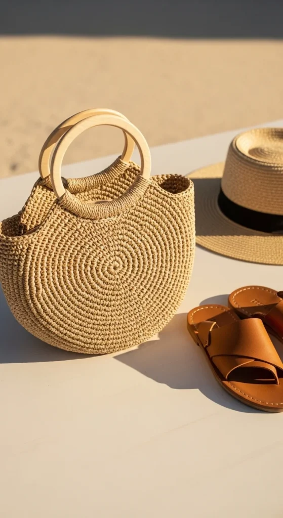 A minimal round raffia-look tote has that high-street summer feel people love because it looks airy, earthy, and expensive without being flashy. The round shape is a little different from the usual tote, and that alone gives it a more styled appearance. Raffia-look yarn, paper yarn, or a sturdy natural-toned cotton can all create this effect. Add wooden handles and the bag instantly feels more polished. This kind of tote is ideal for summer outfits, market trips, vacation days, and casual brunches. Keep the color natural, sand, honey, or warm tan for the best result. Since the shape already makes a statement, the stitch pattern can stay simple. A neat lining can help the bag feel stronger and give the inside a more finished look. This tote is a strong choice for makers who want a handmade piece that still feels like something from a chic summer shop display.