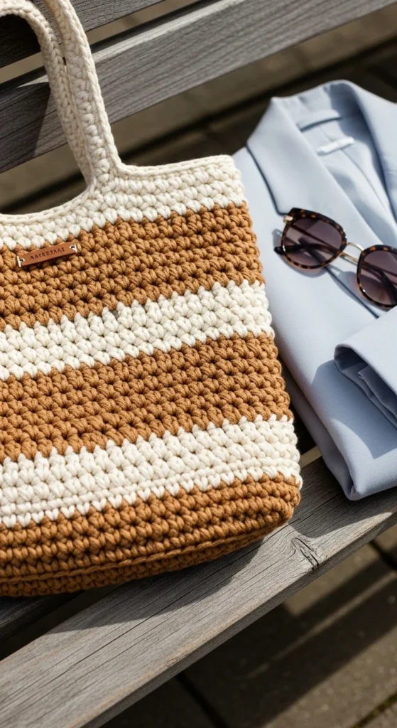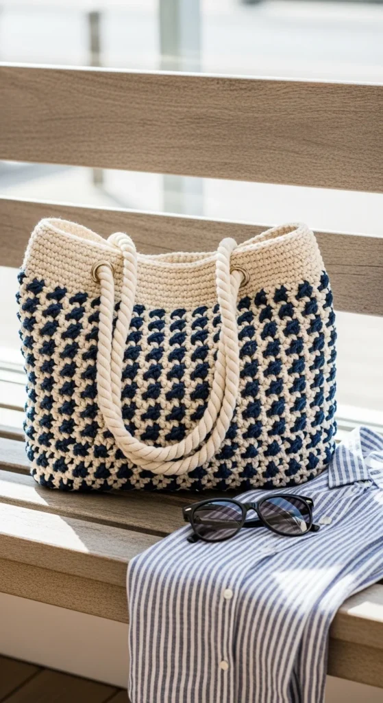 A rope handle nautical tote looks polished because the thick handles give it a strong, structured finish that feels close to luxury beach and resort bags. The contrast between the crocheted body and rope-style handles adds interest without needing much extra detail. Cream with navy is the classic color pairing, but beige with white or taupe with black can also look elegant. The body of the tote can stay simple and medium sized, with a flat base and clean top edge. Cotton yarn works very well here because it pairs naturally with rope and keeps the bag practical. If you want the tote to feel even more finished, line it and add a simple button closure. This style works nicely for beach days, summer errands, travel, and casual daily use. It has a clean, coastal mood that feels polished rather than playful. That is what gives it a more store-like finish.
