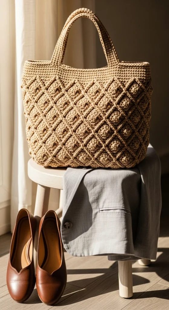 A diamond texture tote made with thicker home decor yarn has a strong store-bought feel because the yarn creates body while the texture adds polish. Even if the construction is simple, the raised surface makes the bag feel more designed and less plain. Sand, cream, camel, and warm brown are especially good here because they highlight the texture without overwhelming it. A structured base helps a lot, and sturdy straps are a must if the tote will be used for daily items. This bag works well for light shopping, everyday errands, or even a smart casual office day with a planner and wallet inside. Keep the shape clean and avoid too many add-ons. One small tag, neat edging, or a lining is enough. This kind of tote feels thoughtful and expensive because it balances texture with simplicity. It is a very strong option for people who want a crochet bag that looks designed rather than just made.