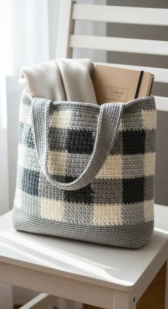 A buffalo check clean-line tote can feel polished when the pattern stays crisp and the bag shape remains simple. The key is to keep the check refined rather than rustic. That means using a neutral palette, a structured body, and clean handles. Cream with charcoal is especially strong for this because it feels graphic and modern without looking too loud. A flat base and straight sides help the checks sit neatly, which makes the whole tote look more expensive. Cotton yarn is best because it holds color changes cleanly and gives better stitch definition. This tote works well for casual daily outfits, errands, or even as a light work bag. A lining can improve structure and keep the inside neat. It is a good choice if you want a patterned tote that still feels calm and wearable. Done well, it looks like something you might find hanging in a well-styled little fashion shop.