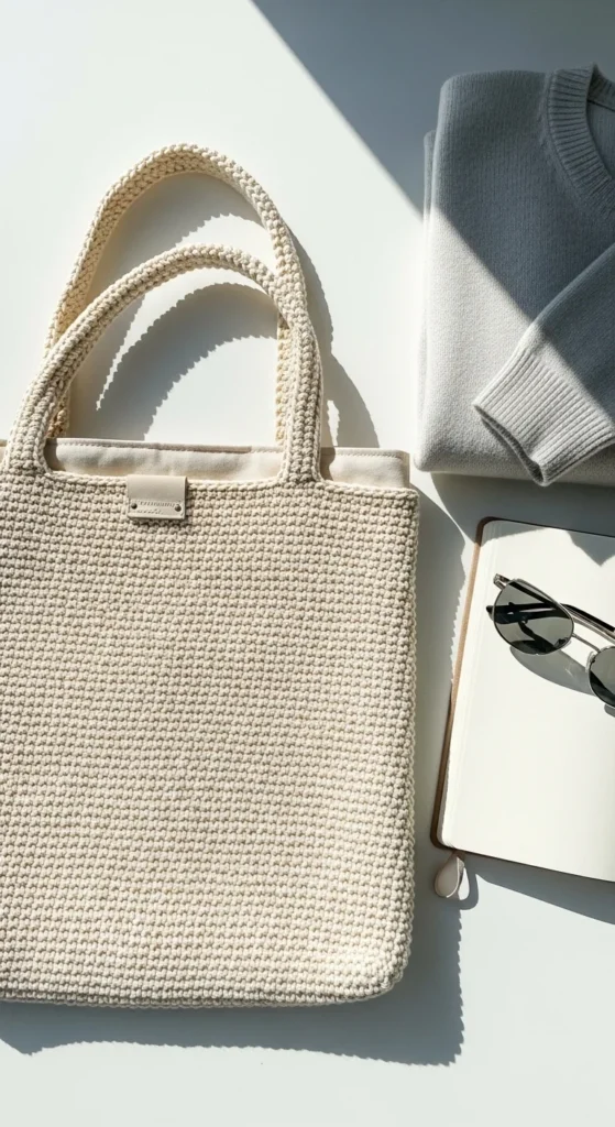 A mercerized cotton everyday tote is one of the easiest ways to get a polished result because the yarn itself already has a smooth, slightly glossy surface. That light sheen helps the stitches look sharper and cleaner, which makes the finished bag feel closer to boutique canvas or woven designer fabric. A simple rectangular body with straight sides is enough here because the yarn does a lot of the visual work. Cream, camel, navy, black, and soft taupe are all strong choices if you want the bag to look refined and easy to wear often. Add long shoulder straps and keep the stitch pattern neat and simple so the overall shape stays calm. A lining can make the bag feel even more finished and help small items stay in place. This is a good tote for work papers, sunglasses, a wallet, and daily basics. If you want a store-like result without spending much on embellishment, this style is a smart place to begin because the polish comes from the yarn, the shape, and the clean finish.