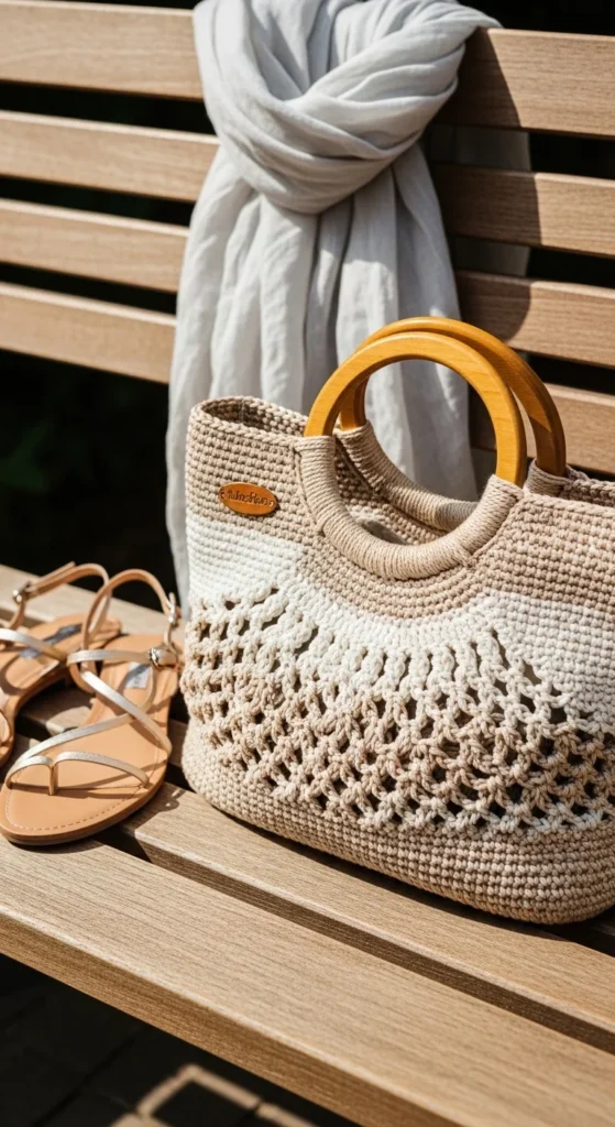 A wooden ring handle boutique tote has instant shop appeal because the hard handle detail makes the bag feel more finished and designed. Even a simple crocheted body looks more polished once those round wooden handles are added. They bring shape, contrast, and a little structure without needing much else. This style works very well in natural, cream, sand, or muted terracotta yarn. The tote body can stay simple, either slightly rounded or softly rectangular, so the handles remain the focus. A lined interior helps the bag feel even stronger and more polished. This kind of tote is lovely for spring and summer outfits, shopping days, and lunches out. It has a boutique quality that feels stylish but still easy to make. If you want your crochet tote to look less like a casual project and more like a finished accessory, wooden ring handles are one of the fastest ways to get there.