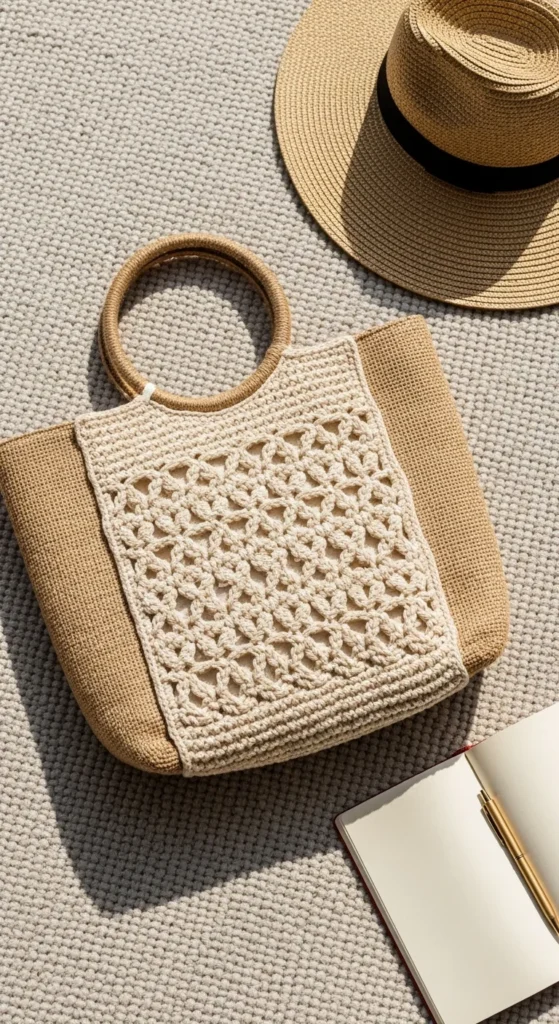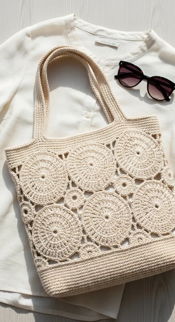 A filet circle panel tote brings in a lighter, fashion-forward detail while still keeping the overall bag polished. The trick is to use the airy panel only as one design feature, then balance it with a solid base and simple structure. That way the tote feels elegant rather than too open or loose. Cream, ivory, taupe, and pale sand are perfect colors for this kind of design because they make the pattern feel refined. A lining is especially useful here so the bag feels practical as well as pretty. Keep the handles plain and strong so the filet section remains the highlight. This tote is ideal for warm-weather outfits, light shopping, brunch, or travel. It has a more designer-inspired mood than a standard mesh tote, which is why it can look so polished when styled well. This is a good option if you want something a little different but still calm, wearable, and shop-ready.