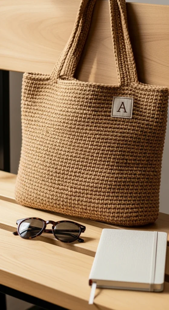 A monogram-ready minimal tote looks polished because it keeps the bag simple and then adds one quiet custom detail. That little personal touch can make the tote feel more like a shop piece made to order. The key is restraint. Use a plain structured body in cream, camel, black, taupe, or olive, then add a small embroidered initial, stitched patch, or neat label near the top. Do not crowd the bag with other decorations. A clean font or subtle stitching is enough. Cotton yarn is a strong choice because it helps the bag hold shape and gives the surface a crisp look. Long shoulder straps or faux leather handles both work well. Add a lining if you want the tote to feel even more complete. This is a lovely project for gifting too, since a personal detail makes it feel thoughtful without making it less wearable. The result feels polished, calm, and special in a simple way.