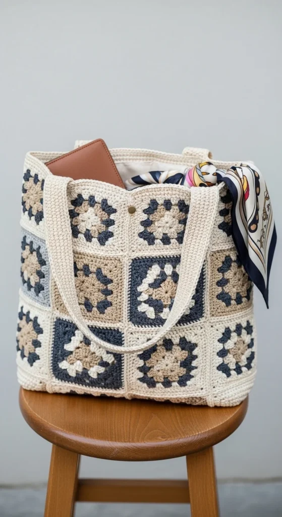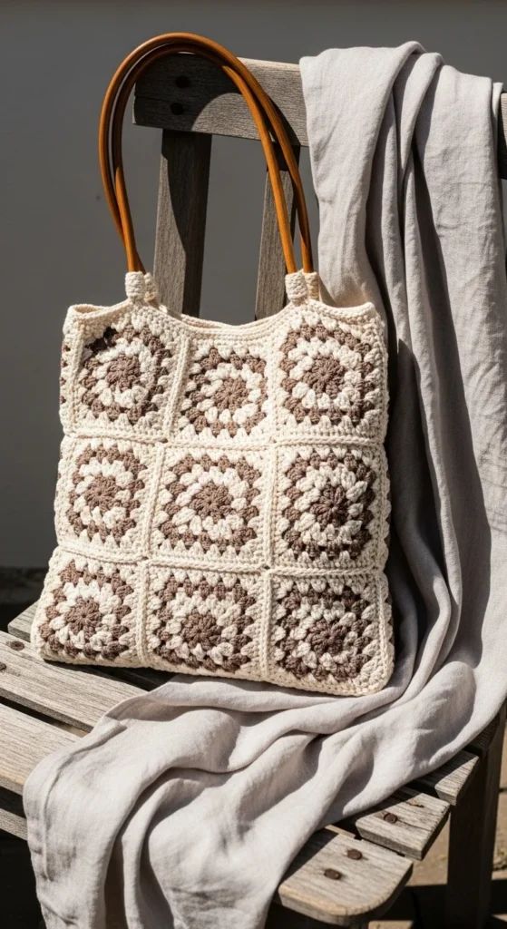 A modern granny square tote can absolutely look store-bought when the colors are kept neutral and the seams are done neatly. The old rainbow version can feel playful, but a toned-down palette changes everything. Cream, beige, brown, black, olive, and taupe give granny squares a far more mature and polished look. The key is to keep the joining neat and the shape structured. A lining can help the bag hold better form and stop smaller items from slipping through any tiny gaps. Faux leather handles or firm crocheted straps can make the tote look even more finished. This style works well for people who like classic crochet motifs but still want a cleaner, more fashion-ready result. It feels handmade in a good way, with visible craft and texture, but the calm colors keep it refined. This kind of tote looks especially good with simple outfits because it adds pattern and warmth without feeling too busy.