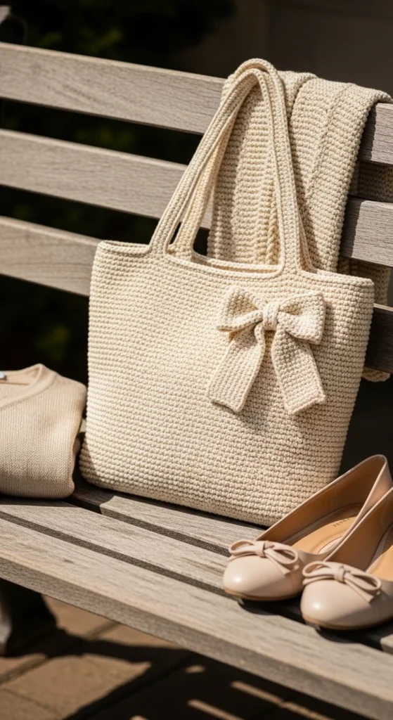 A boutique bow accent tote can still look polished as long as the bow stays neat and restrained. One small detail like that can soften the bag and make it feel styled, but too much decoration can take away the refined look. A cream, blush-beige, taupe, or black tote body works best because it keeps the overall design grounded. The bag itself should be simple and structured, with clean sides and strong handles. Then the bow becomes a small finishing touch rather than the whole statement. Cotton yarn is ideal because it helps both the tote and the bow hold shape. Add a lining if you want the inside to feel more complete. This kind of tote is especially lovely for lunches, everyday wear, light shopping, or gifting. It feels polished in a softer way than the more structured office totes, but it still has that boutique mood when the colors are calm and the finishing stays neat.