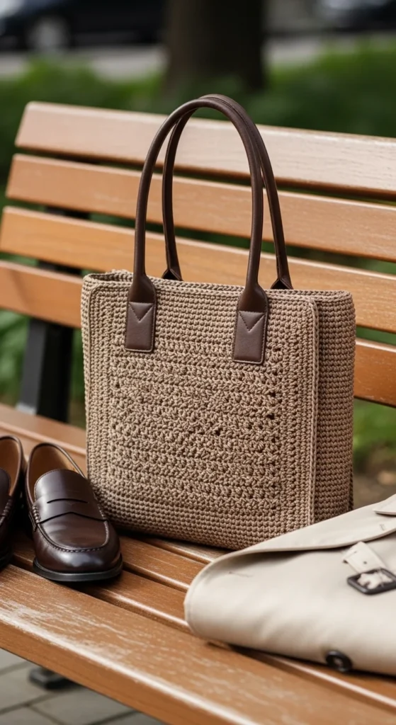 A crochet tote with faux leather handles instantly feels more polished because the contrast between soft yarn and sleek straps creates a cleaner, more finished look. It is one of the easiest upgrades for anyone trying to make a handmade bag look store-bought. Even a very simple tote body can feel more expensive once those handles are added. A neutral yarn color helps even more. Cream, taupe, black, camel, and charcoal all work beautifully because they let the handle detail stand out without making the bag too busy. This type of tote works well for errands, casual office days, and lunch outings because it looks neat while still being useful. If real leather is out of budget, faux leather straps or handle covers can still give a polished result. Keep the body shape plain and structured so the bag feels balanced. A lining inside can make it stronger and neater. This is a great example of how one finishing detail can shift the whole mood of a crochet tote from homemade to polished and shop-ready.