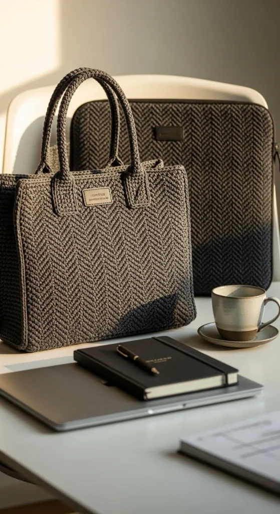 A herringbone office tote has a cleaner and more polished feel than many casual crochet bags because the stitch pattern creates a tighter, more refined surface. It looks thoughtful and structured without needing a lot of extra decoration. That makes it a strong choice for a work bag or everyday tote you want to carry with smarter outfits. Charcoal, black, navy, taupe, and deep olive are good colors here because they feel calm and professional. Use a straight shape with a flat base so the tote can hold a planner, slim laptop sleeve, notebook, and small personal items without collapsing too much. Cotton or a cotton blend is ideal if you want the texture to stay crisp. Add a lining if you plan to carry smaller things like pens or keys. This tote looks especially nice with simple metal hardware or clean faux leather handles. It feels practical and grown-up, which is why it suits office days so well. The stitch pattern helps it stand out, but in a subtle and polished way.
