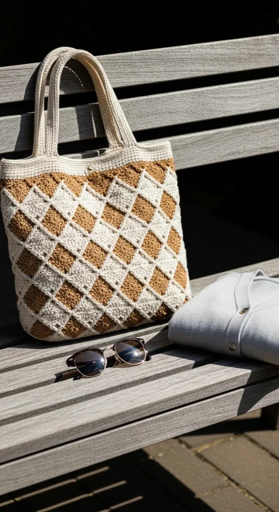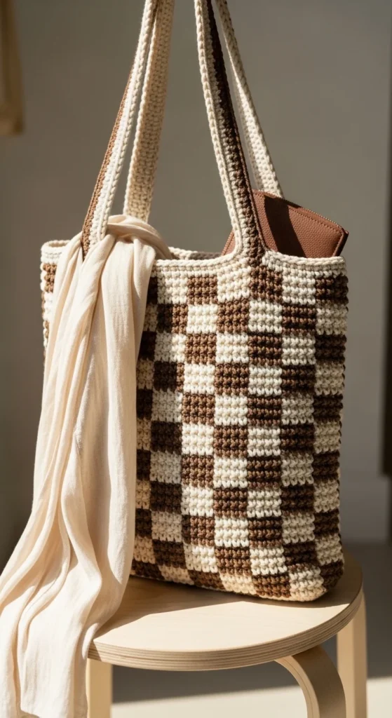 A checkered boutique tote can look very polished when the colors are soft and the pattern stays clean. The trick is to avoid loud contrast and go for shades that feel calm and wearable. Cream with mocha, beige with grey, or camel with black can all create a more refined version of the checkered look. When done well, the pattern feels graphic and fashion-forward rather than playful. A structured tote shape helps a lot here because it keeps the pattern lined up neatly and stops the bag from looking floppy. Cotton yarn is a strong choice because it helps the color blocks stay crisp. Keep the handles plain and skip extra embellishment so the check design remains the focus. A lining is helpful, especially if the bag will carry daily items. This style is a great option if you want something with pattern but still want the final result to look polished and expensive. It has a designer-inspired feel while still being practical enough for shopping, errands, or casual work days.