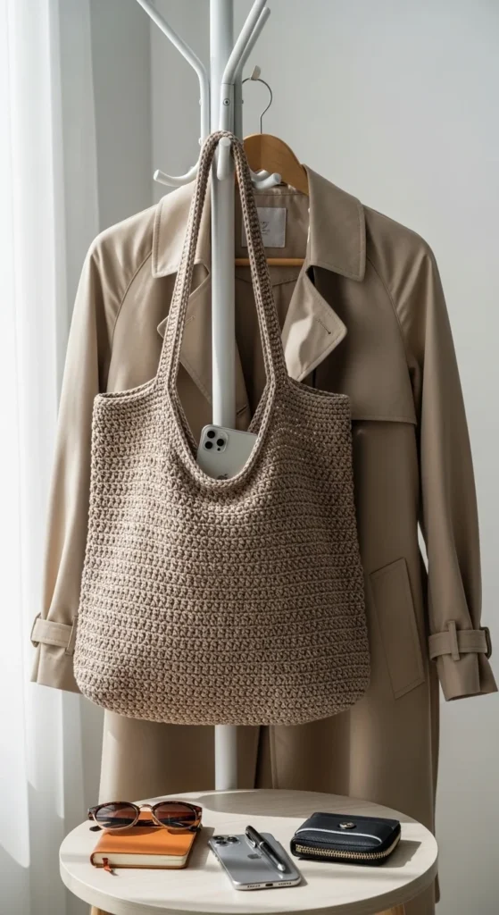 A polished market-to-office hybrid tote is a smart final idea because it brings together the two things people want most from a crochet tote: everyday usefulness and a refined finish. This kind of bag is roomy enough for a planner, light cardigan, wallet, and small shopping items, but it still looks neat enough to carry into a café or office. The best way to get that balance is with a structured base, neutral yarn, and long clean handles. Oatmeal, black, taupe, navy, and cream are especially good because they fit both casual and smarter settings. Use a simple stitch pattern and let the shape carry the design. A lining and inside pocket can make the tote feel even more practical. This is the kind of bag many people would actually reach for again and again, which is part of what makes it feel store-bought. It is useful, wearable, and polished in a very real everyday way.
