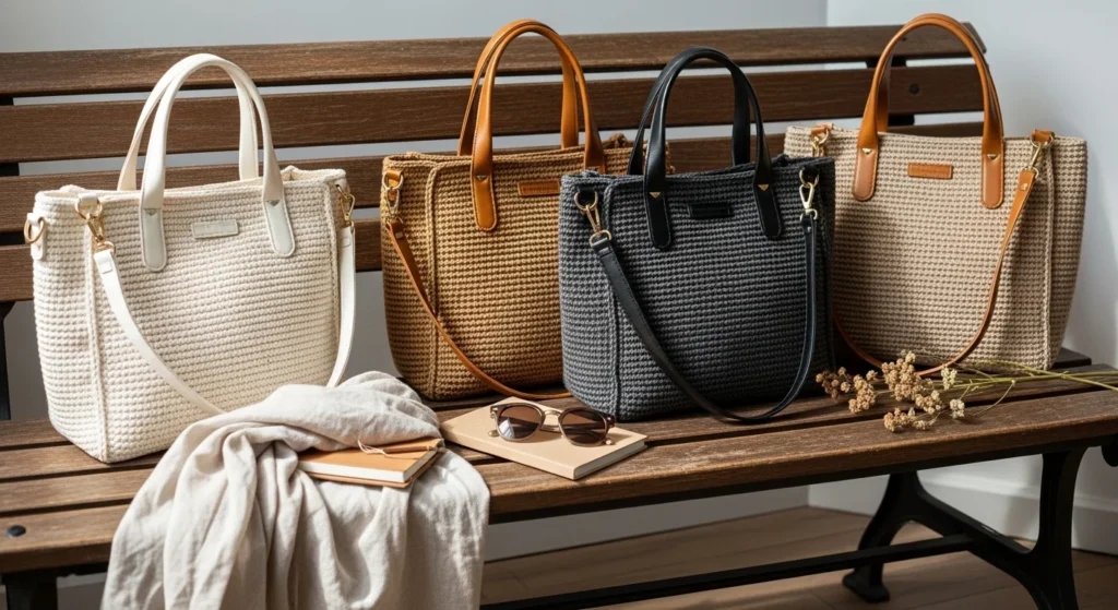 A boutique bow accent tote can still look polished as long as the bow stays neat and restrained. One small detail like that can soften the bag and make it feel styled, but too much decoration can take away the refined look. A cream, blush-beige, taupe, or black tote body works best because it keeps the overall design grounded. The bag itself should be simple and structured, with clean sides and strong handles. Then the bow becomes a small finishing touch rather than the whole statement. Cotton yarn is ideal because it helps both the tote and the bow hold shape. Add a lining if you want the inside to feel more complete. This kind of tote is especially lovely for lunches, everyday wear, light shopping, or gifting. It feels polished in a softer way than the more structured office totes, but it still has that boutique mood when the colors are calm and the finishing stays neat.