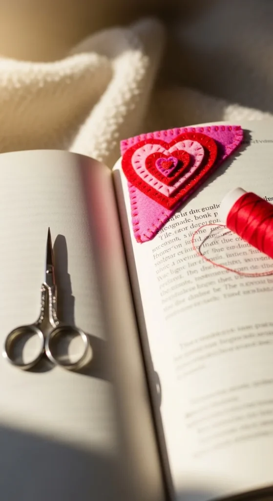 A felt heart corner bookmark is one of the easiest ways to make reading feel more cheerful. It slips over the page corner, stays in place well, and uses only a few simple supplies. You can cut two heart-shaped pieces of felt, stitch or glue the sides, and leave the top open so it hugs the page. This craft works well for beginners because felt does not fray much, so you do not have to fight with messy edges.